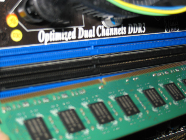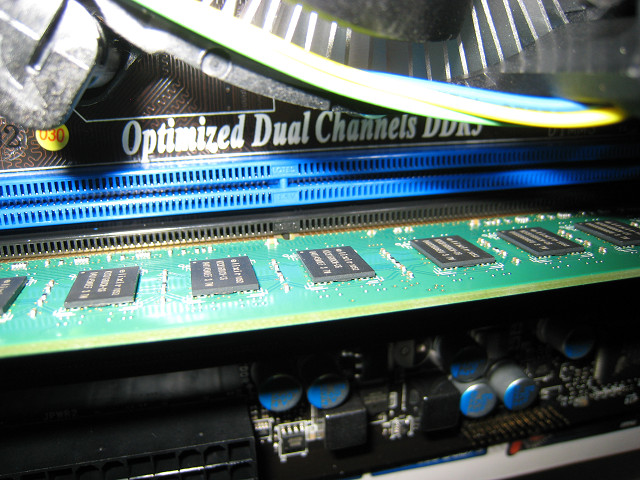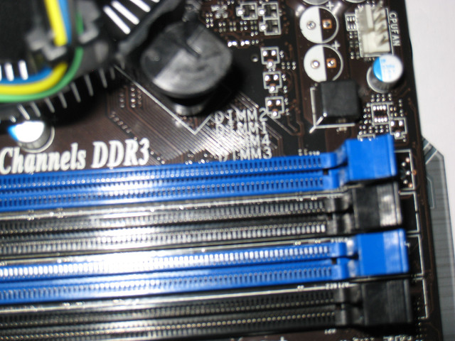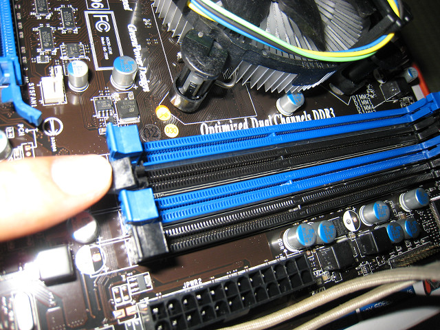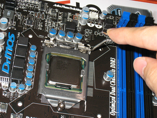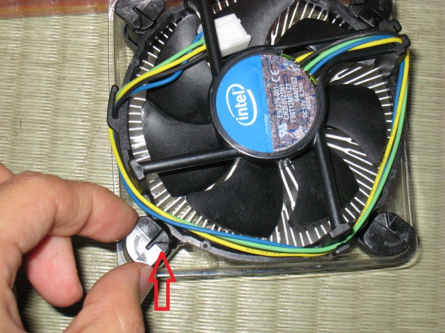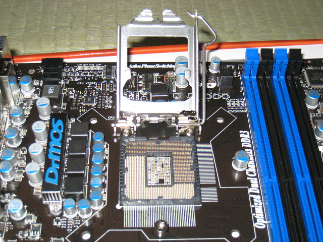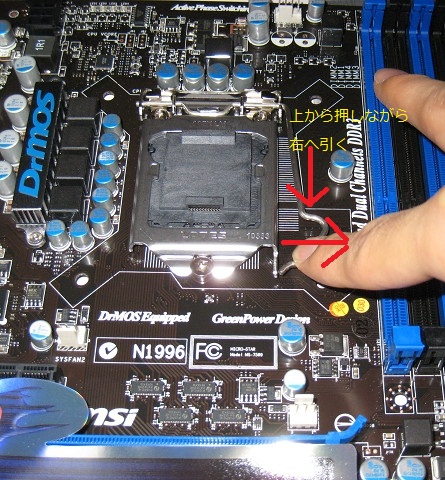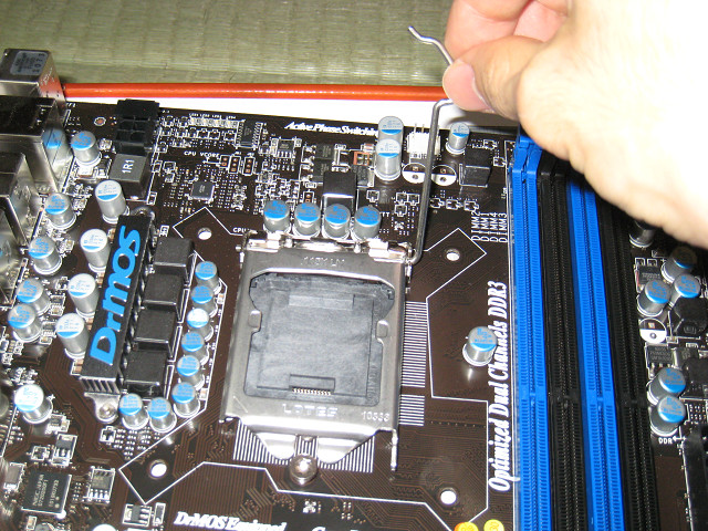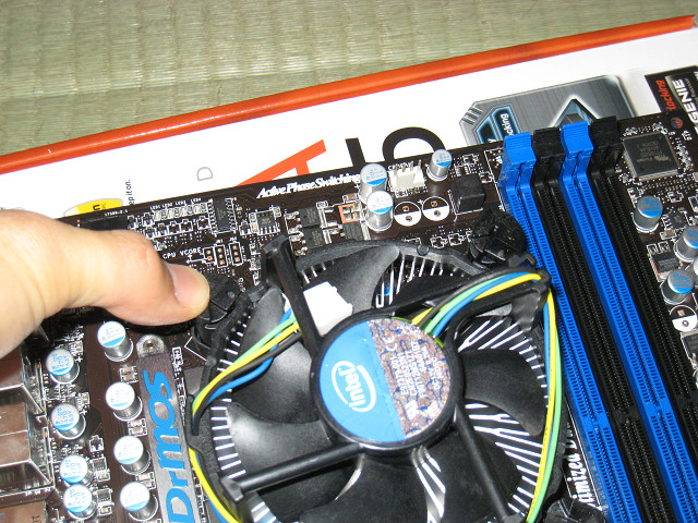 上から押して「パチン」と音がするまではめ込みます、マザーボードがミシミシ言います。