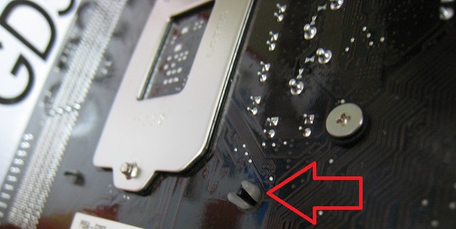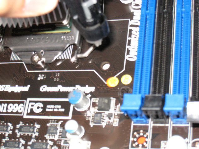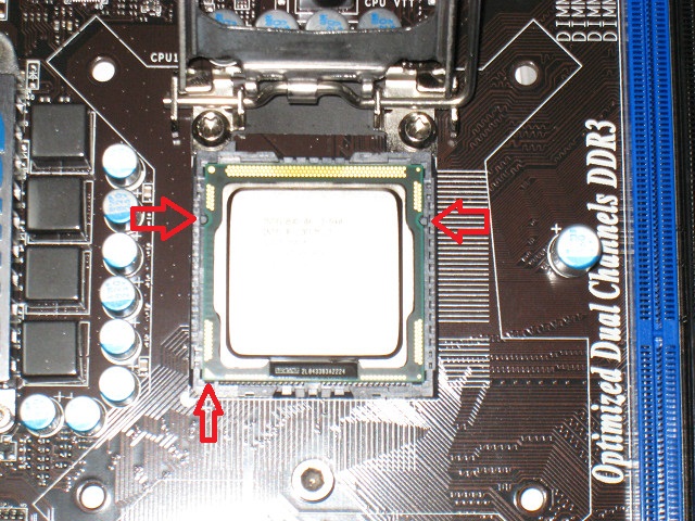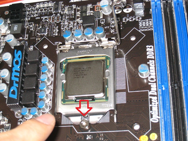 上の矢印二つは、CPU側のへこみとマザーボード側の丸い出っ張りとが一致するかと、