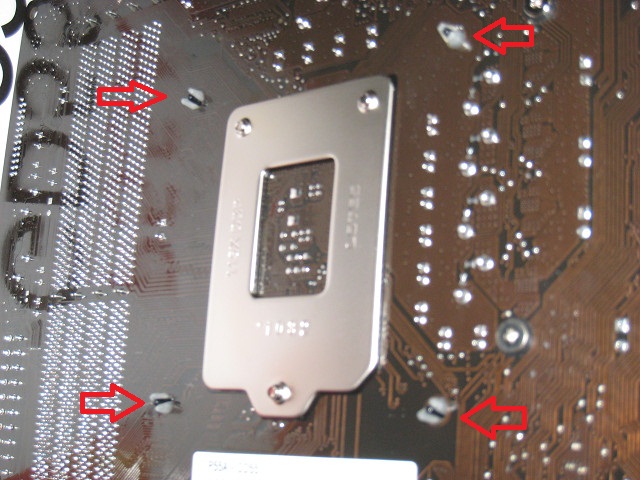 マザーボードの裏を見ますと、4箇所のCPUクーラーの足が見えます。